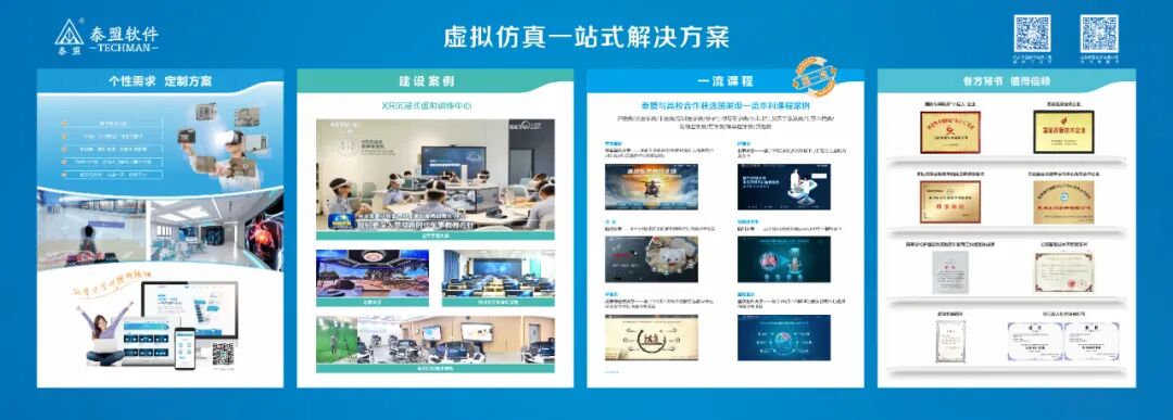 另一个例子是校企合作促进教学发展。虚拟仿真教学是我们教学改革的重点方向,它的存在也确确实实可以为实验解决一些如实验本身、场地或时间限制等问题。成都泰盟与空军军医大学合作建立的XR沉浸式教学体验馆,共同完成了军事医学虚拟仿真实验室建设及装备化标准研究课题,并获批虚拟仿真实验教学创新联盟优秀课题,面向全国推广。