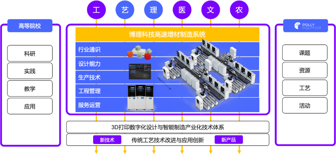 数字化改革与高质量发展,是当代各行业发展的新形势。在此时代机遇下,淘汰落后产能,以数字化、智能化、自动化的方式对行业传统技术与模式进行改造必然成为新趋势。基于3D打印智能制造的新动能、新工艺、新人才有着宽阔的应用空间,是助力产业数字化升级改造的源动力,而在此形势下的产教融合、协同创新,即表现为多种合作方式下的新型校企合作。鉴于此,博理科技将以“3D打印终端产品规模化制造”的技术优势,以“数字化设计与数字制造”的技术路径,以“数智驱动的高速增材制造系统”的产品形式,以3D打印全产业链的科研与技术成果,面向全国高等院校提供个性化的学科建设与人才培养服务解决方案。